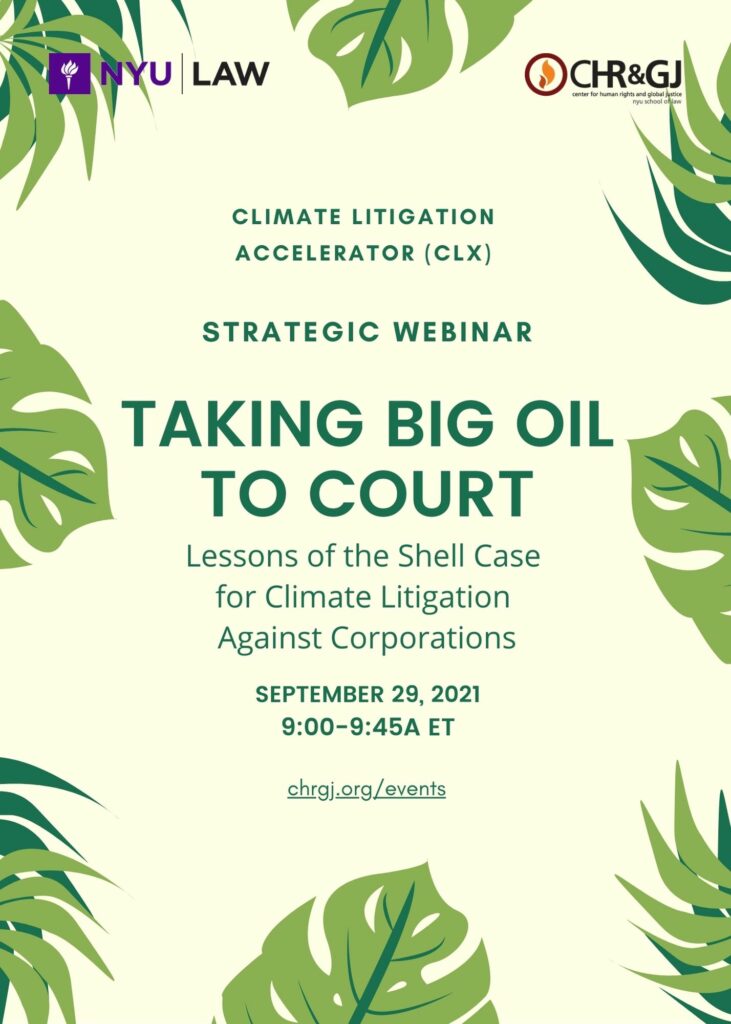 Op 29 september 2021 sprak ik over de klimaatrechtzaak tegen Shell bij het Center for Human Rights and Global Justice van New York University. Dit seminar getiteld 'Taking Big Oil to Court; Lessons of the Shell Case for Climate Litigation against Corporate Actors' werd geleid door prof. César Rodriguez-Garavito en de andere spreker was Sjoukje van Oosterhout.